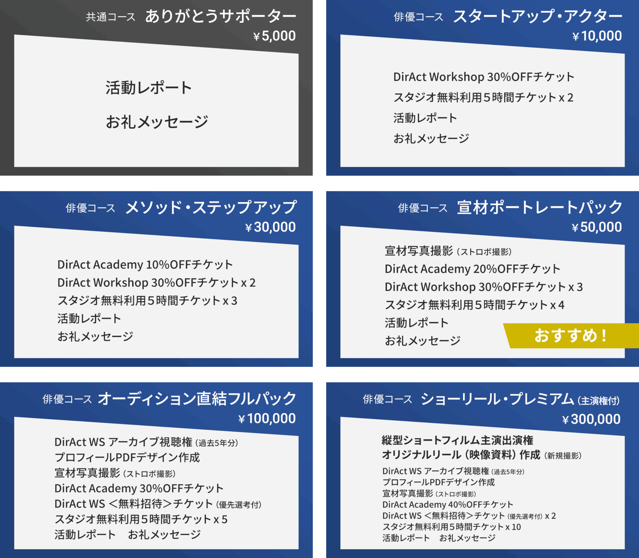 俳優コースは、“届く演技”を身につけ、 現場への導線を太くする ことにフォーカスした構成です。ワークショップにスクール、そしてスタジオの割引チケットや、印象を的確に伝える 宣材写真撮影 や プロフィール作成 で武装。映像資料が必要な方には、希望のシーンを新規撮影する オリジナルリール作成 や、 縦型ショートフィルムへ主演出演 できる権利も設定。スクールで基礎を固め、WSで実践を浴び、プロフィールと映像で“見つけられる準備”を整える——この一連を、リターンで完結できるよう設計しています。