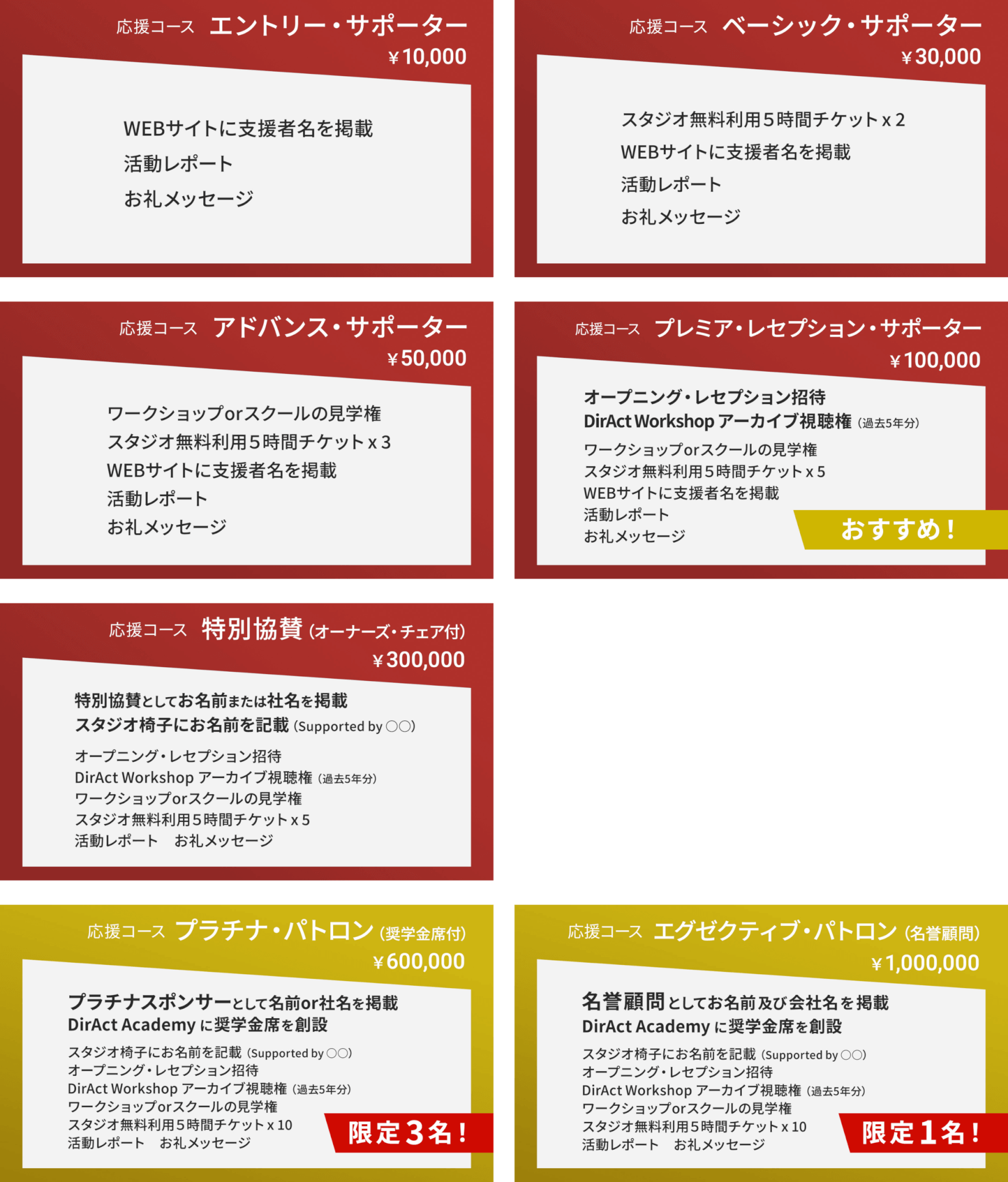 「DirAct Academy」公式WEBサイトに、名誉顧問 の称号とともに、お名前および会社名(ロゴ)を掲載いたします。 この称号は、芸術教育の未来を支える存在として、特別な敬意を込めて授与されるものです。 単なる支援を超え、理念への深い共感と創設期への貢献を示す象徴的なポジション として、公式に刻まれます。掲載は視認性の高い特別枠にて行われ、継続的なPR効果が期待されるほか、「DirActの礎を築いた名誉支援者」として、長く記録に残る特別なリターン となります。