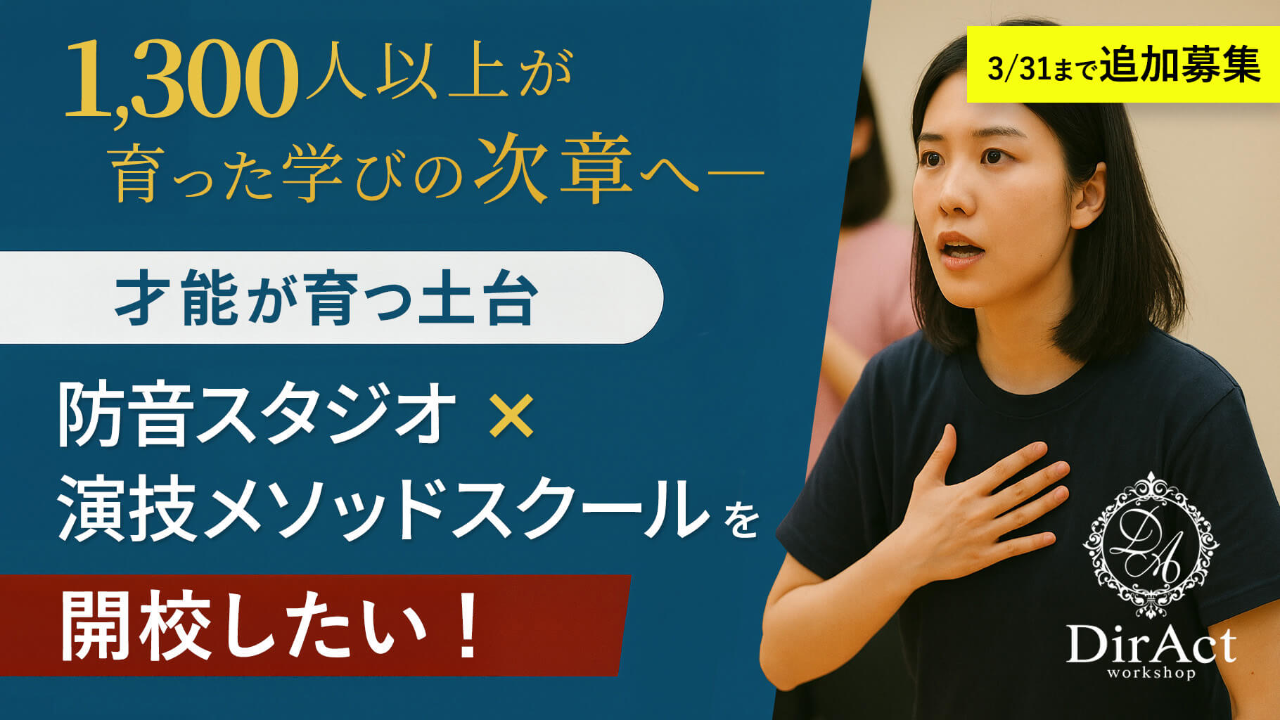 大声も動きも遠慮なく出せる、防音の「DirAct STUDIO」を新設し、従来の監督ワークショップに加え、週1・月4の定期スクール「DirAct Academy(アカデミー)」を開校します。ここでは、演技メソッドを基礎から体系的に学べるカリキュラムを用意し、 積み上がる力を育てます。