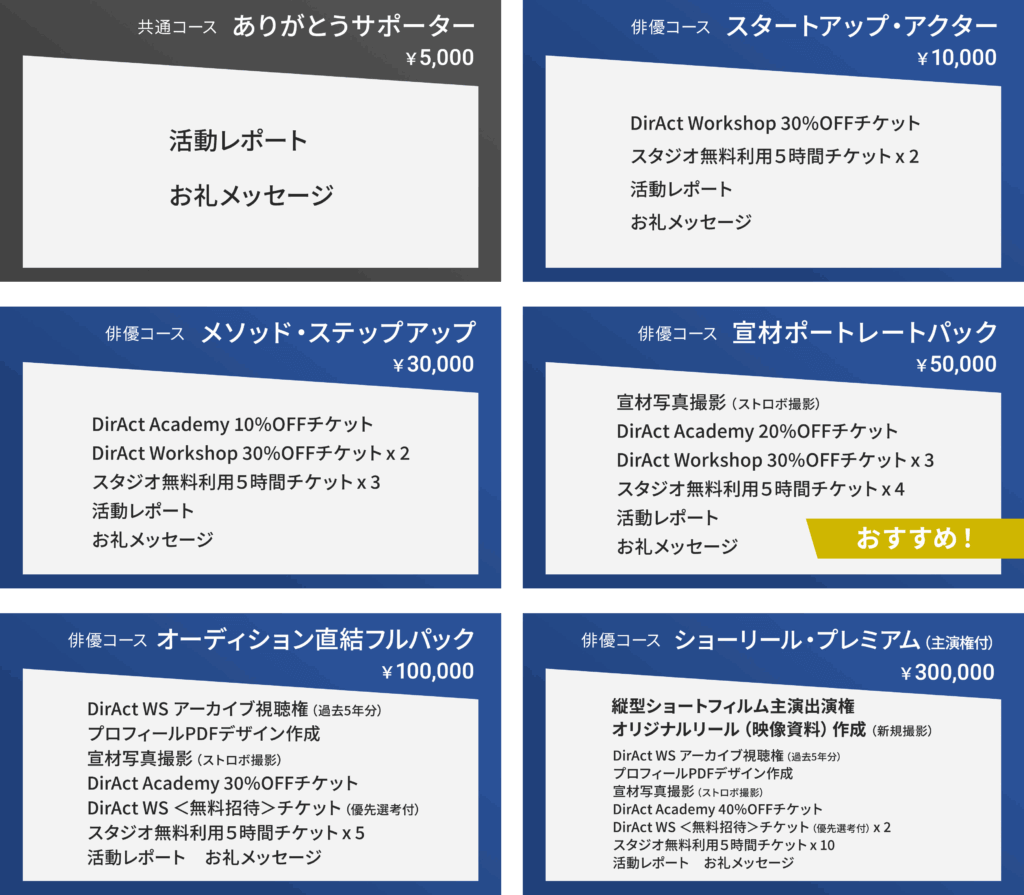 俳優向けのリターンは、“届く演技”を身につけ、 現場への導線を太くする ことにフォーカスした構成です。ワークショップにスクール、そしてスタジオの割引チケットや、印象を的確に伝える 宣材写真撮影 や プロフィール作成 で武装。