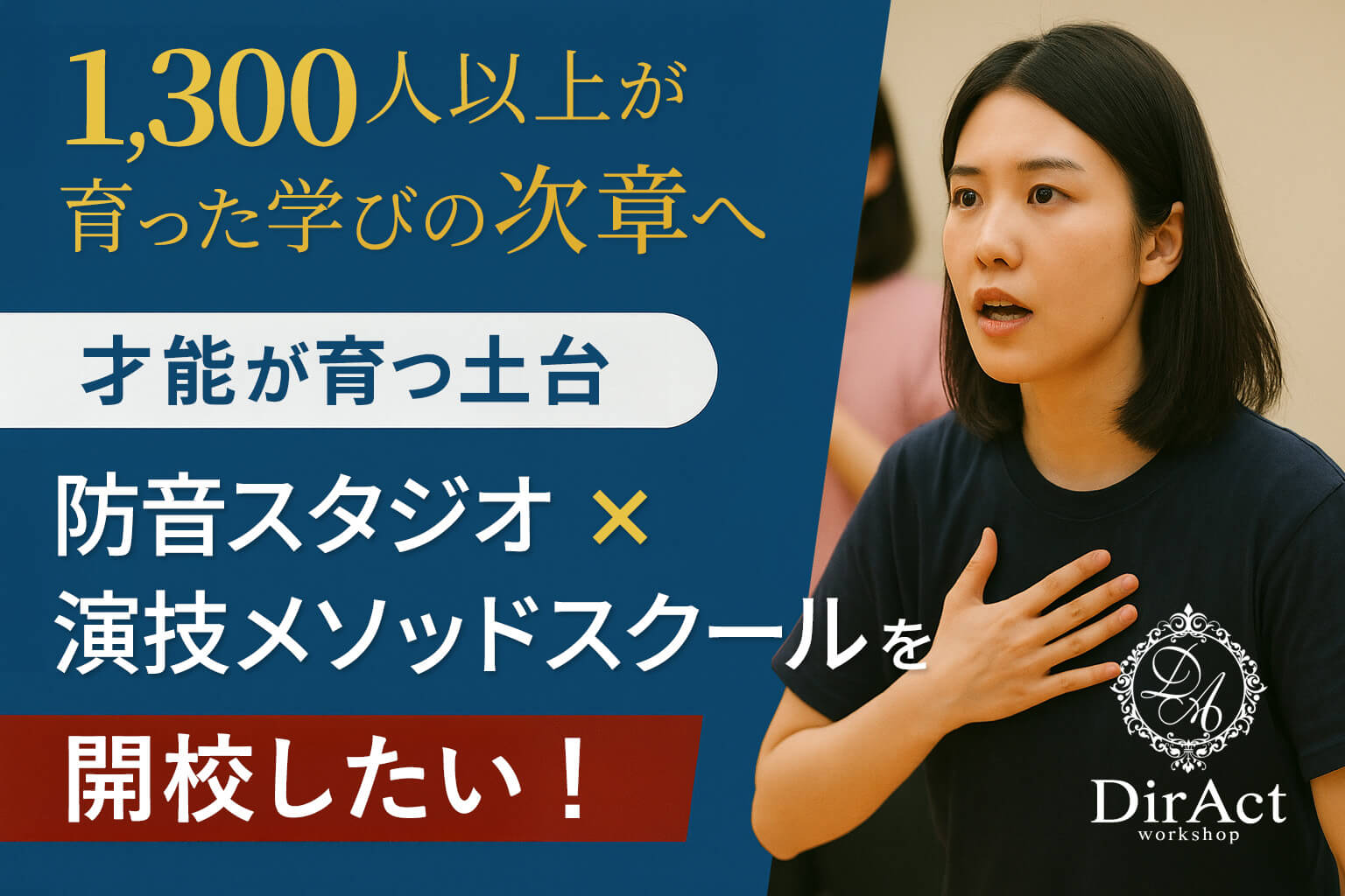 DirAct workshopでは、防音スタジオ「DirAct STUDIO」の新設、および演技スクール「DirAct school」の開校に向けて、役者志望の皆様のお声を伺うためアンケートを実施しております。(回答期限11/28)